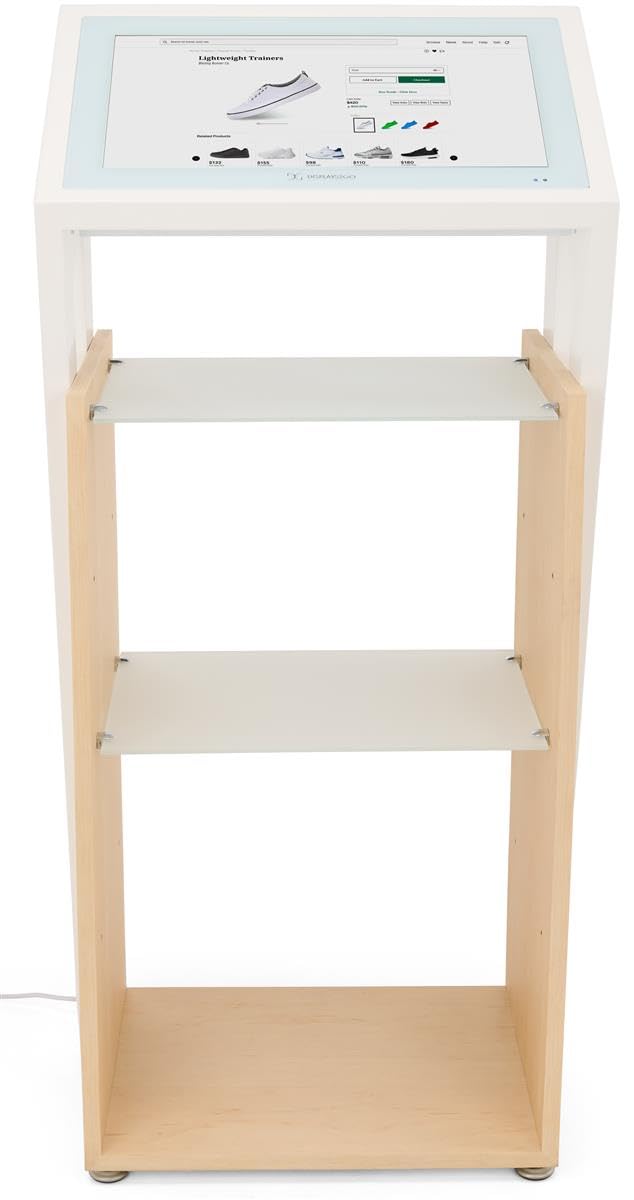 Displays2go 21.5" Touch Digital Retail Kiosk with Adjustable Shelves, Android 11 - White/Maple Wood