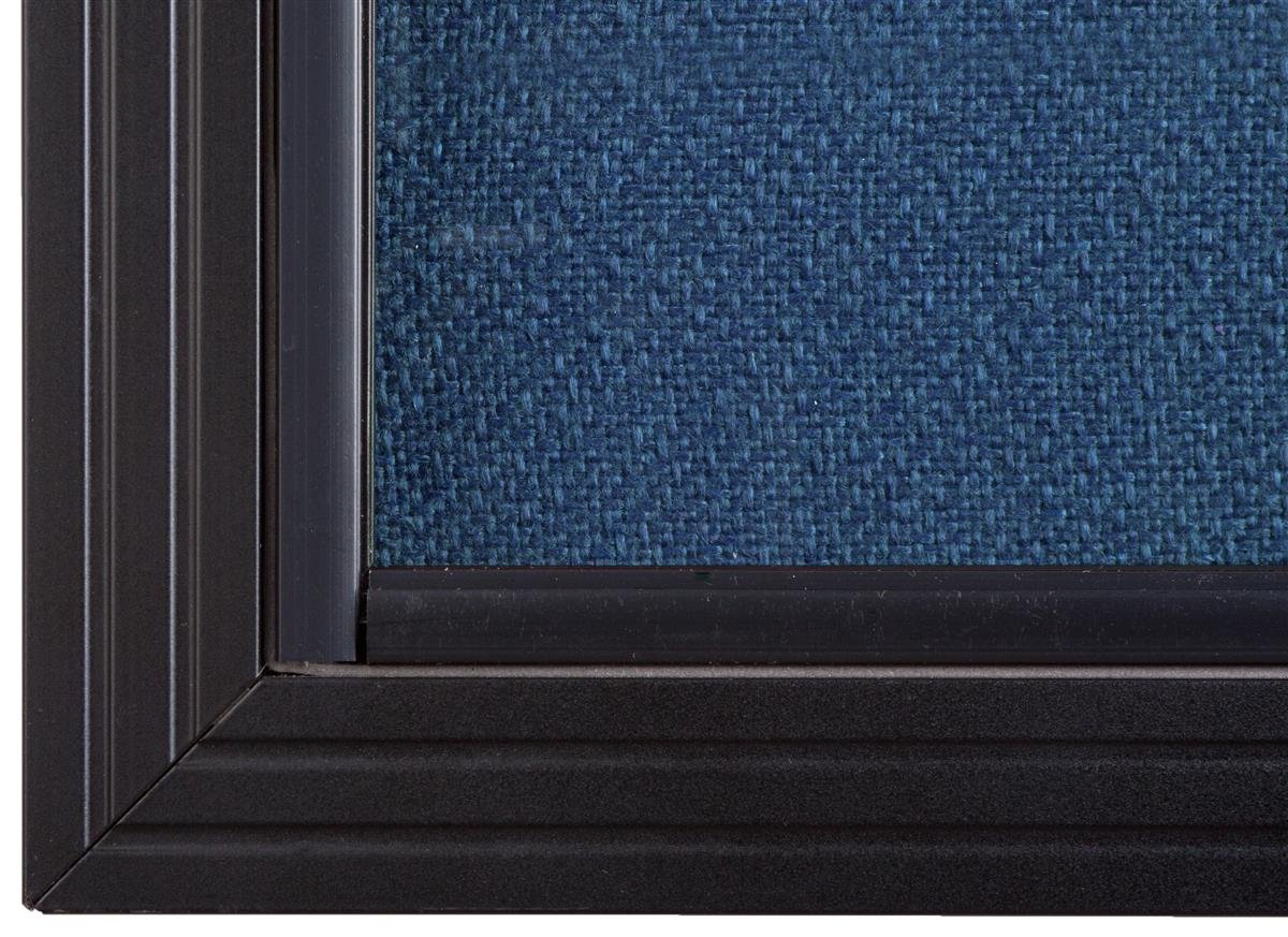 - Enclosed bulletin board measures 48" x 36" with a dark blue fabric backboard. Viewable area measures 45" x 33"