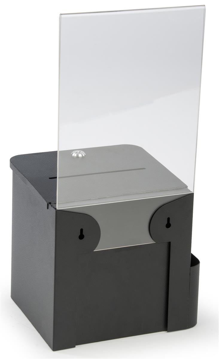 Suggestion and Ballot Box, Locking, Includes Pocket for Envelopes, 8.5" x 11" Sign Holder (Black Metal)
